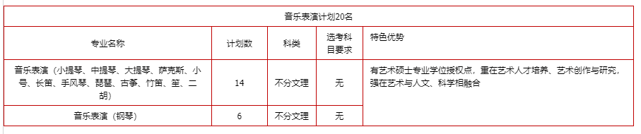 | 音乐表演(小提琴、中提琴、大提琴、萨克斯、小号、长笛、手风琴、琵琶、古筝、竹笛、笙、二胡) | 14 | 不分文理 | 无 | 有艺术硕士专业学位授权点,重在艺术人才培养、艺术创作与研究,强在艺术与人文、科学相融合 |