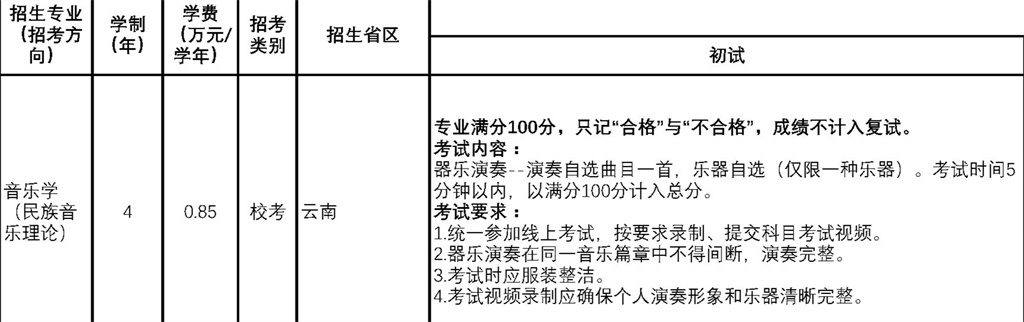 4.校考专业在云南省以外的省区不做分省分专业招生计划,专业合格线在1比4范围内划定(即合格人数不超过相应专业招生计划数的4倍),文化控制分数线由我校根据投档生源情况自行划定。