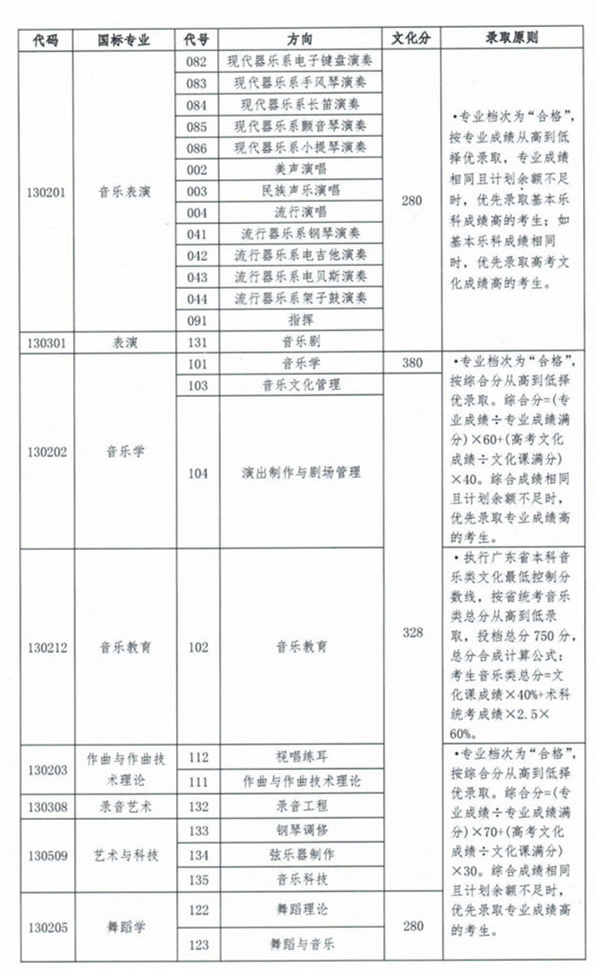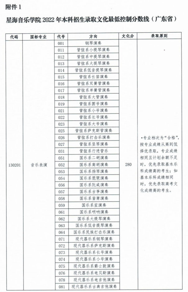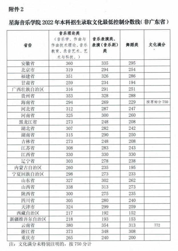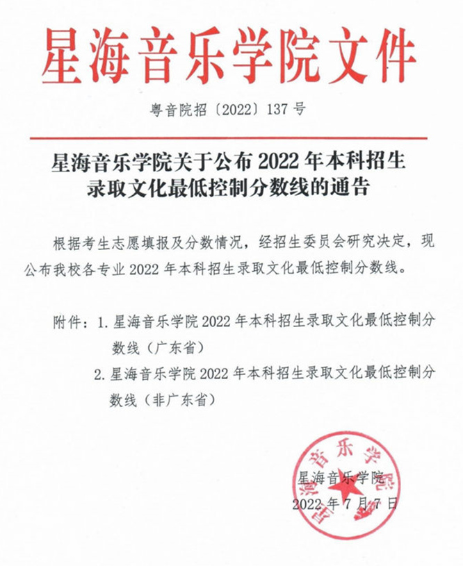 星海音乐学院2022年本科招生录取文化最低控制分数线
