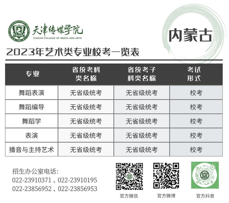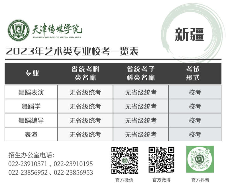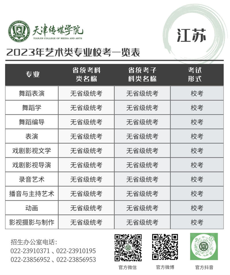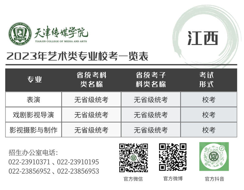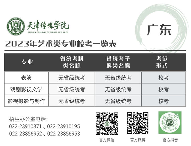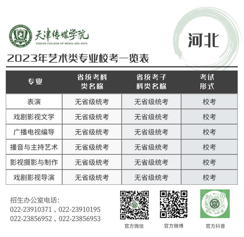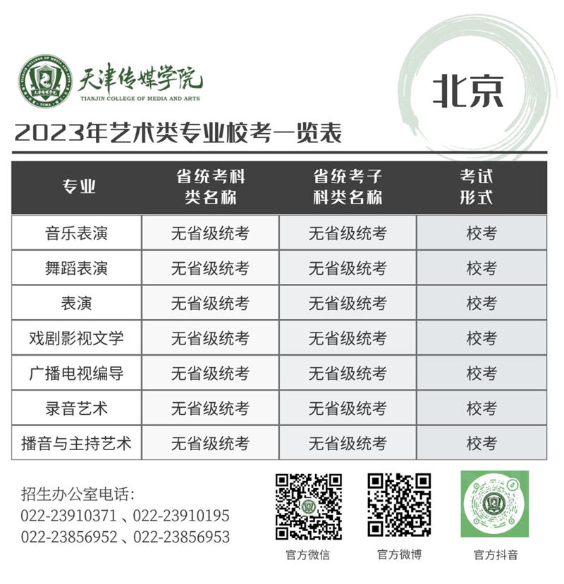 根据《教育部办公厅关于做好2023年普通高等学校部分特殊类型招生工作的通知》(教学厅〔2022〕8号)精神和天津市教育招生考试院的有关部署,结合疫情防疫防控要求,按照《天津传媒学院2023年招生简章》的相关内容,现将我校2023年艺术类专业校考公告公布如下: