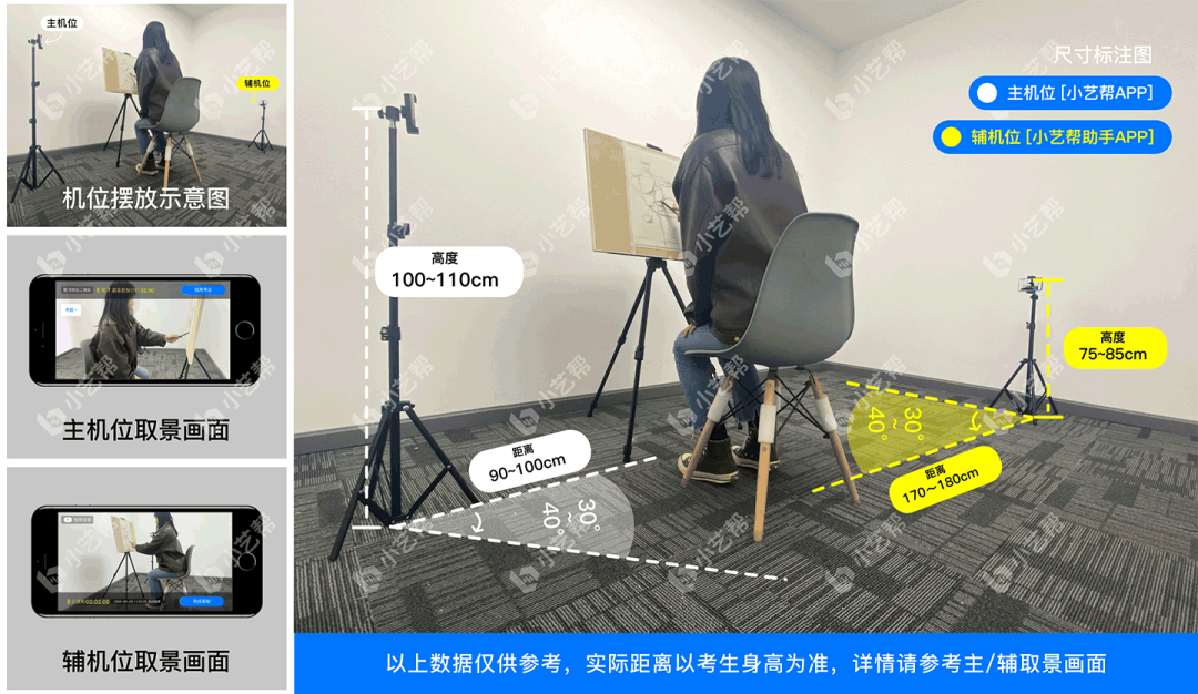1.广播电视编导、影视摄影与制作、录音艺术、戏剧影视导演、戏剧影视文学、戏剧影视美术设计、动画、数字媒体艺术专业的校考采取“双机位考试”模式,考生须准备两部智能手机作为考试终端。考生仅可使用两部手机完成考试:一部手机使用“小艺帮”APP用于考试作答(主机),另一部手机使用“小艺帮助手”APP用于考试监考(辅机)。如有作答环节,考生直接面对主机进行作答。