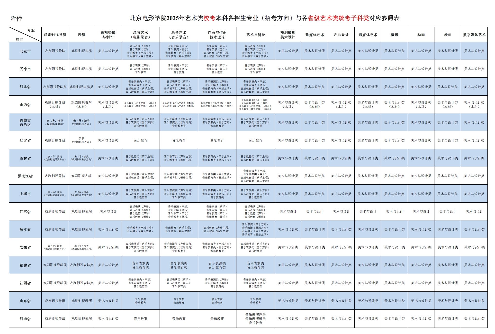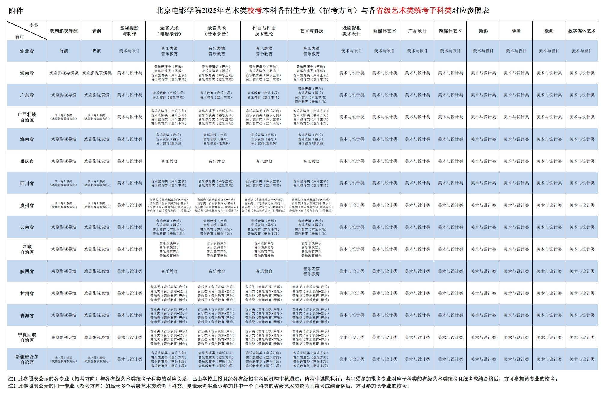 北京电影学院2025年艺术类校考本科各招生专业(招考方向)与各省级艺术类统考子科类对应参照表