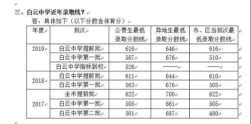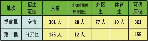 今年白云中学将继续招生12个教学班,合计516人。各类比例如下:提前批次70%,第一批次30%,白云区外15%,非政策性照顾借读生8%。依今年招生政策,指标到校50%。收体育特长生10人(占总招生人数2%),招生项目:田径、篮球、足球。详见下表