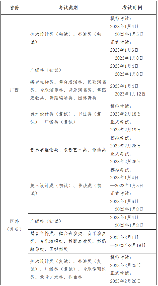 广西艺术学院2023年艺术类本科专业招生考试报名、考试时间等事项通知