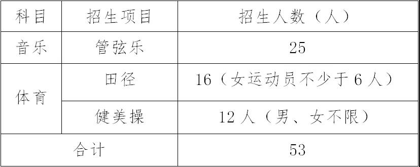 我校2020年高一年级拟招收体育、艺术专项生和特长生共153名。其中,音乐50名(含管弦乐专项生25名、特长生25名),体育53名(含田径专项生16名、健美操专项生12名、特长生25名),美术50名(均为特长生)。具体如下: