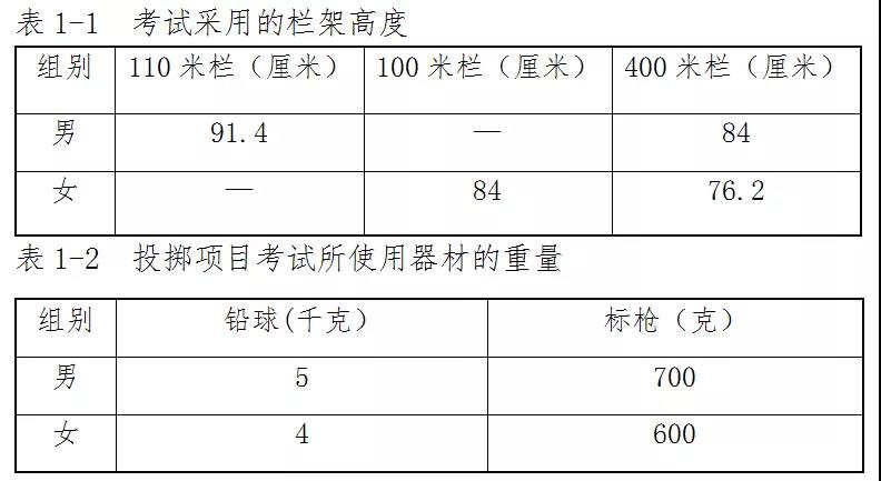 (4)跨栏采用的栏架高度和投掷项目所使用的器材重量,均以以下标准(表1-1和表1-2)。