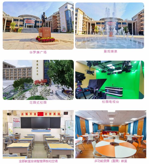 华罗庚中学以“自强不息,志存高远”为校训,以“为学生的一生发展服务”为办学理念,努力落实“向科学管理要质量、向爱岗敬业要质量、向特色办学要质量”的工作思路,落实立德树人根本任务,做有温度有情怀的教育,育有实力有个性的人才。学校先后被评为全国国防教育特色学校、全国心理健康教育示范学校、全国群众体育先进单位、全国消防安全教育示范学校、国家级青少年体育俱乐部、广东省高中教学水平优秀学校、广东省德育示范学校、广东省中华文化传承基地、广东省文明校园等34项国家级、省级荣誉。华罗庚中学正向创建省内一流、全国知名的特色品牌学校奋力前行,呵护每个学子“和谐发展,个性生长”。
