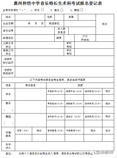 音乐特长生报名登记表