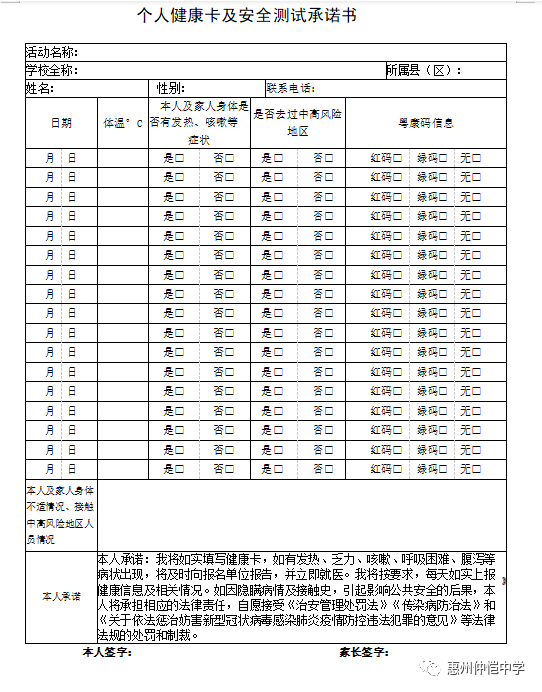 个人健康卡及安全测试承诺书