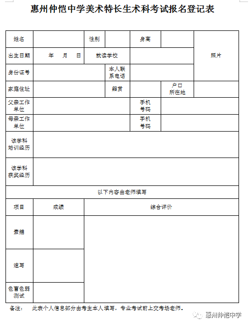 美术特长生报名登记表