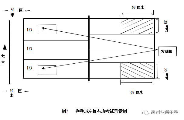 (3)测试方法:考生只进行一次测试。考试开始,发球机交替 供球到考生球台左、右两侧规定区域内。考生必须站在离球台端 线 30 厘米外,运用左推(拨)右攻或两面攻(以下均简称左推右攻)