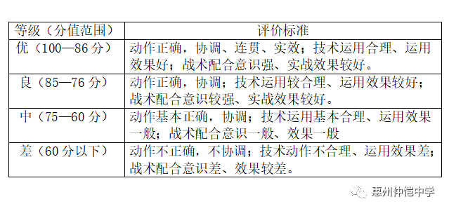 B.评分标准:考评员参照实战评分表(表1-4),从动作的正确、协调、连贯程度,技、战术运用水平以及配合意识等方面,独立对考生进行综合评定。按10分制打分,所打分数至多可到小数点后两位。