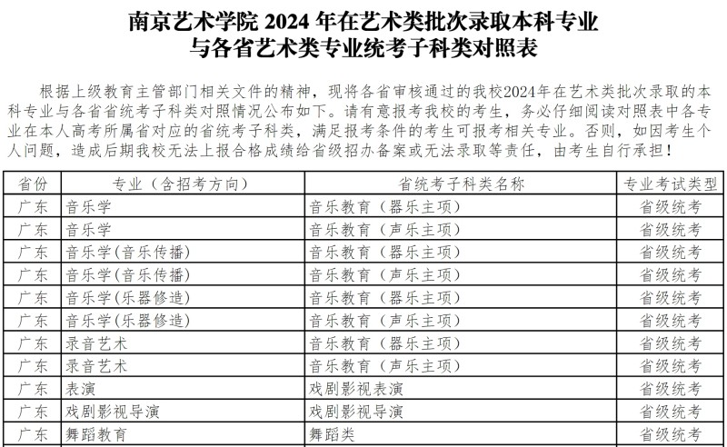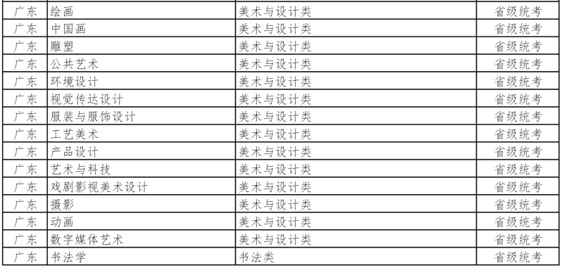 南京艺术学院广东省统考专业
