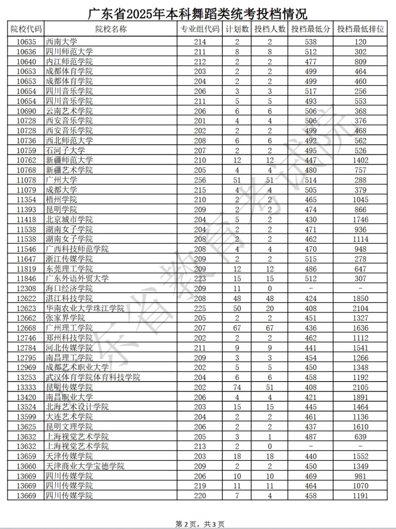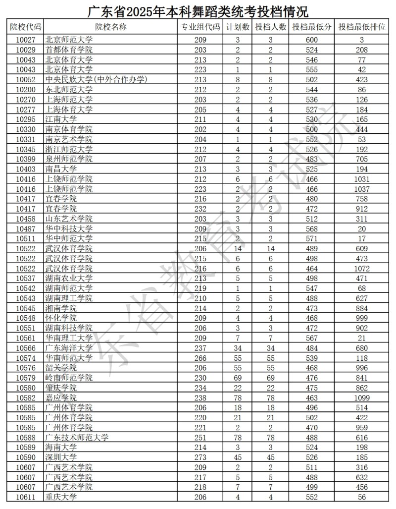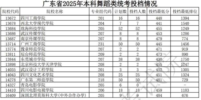 广东省2025年本科舞蹈类统考投档情况