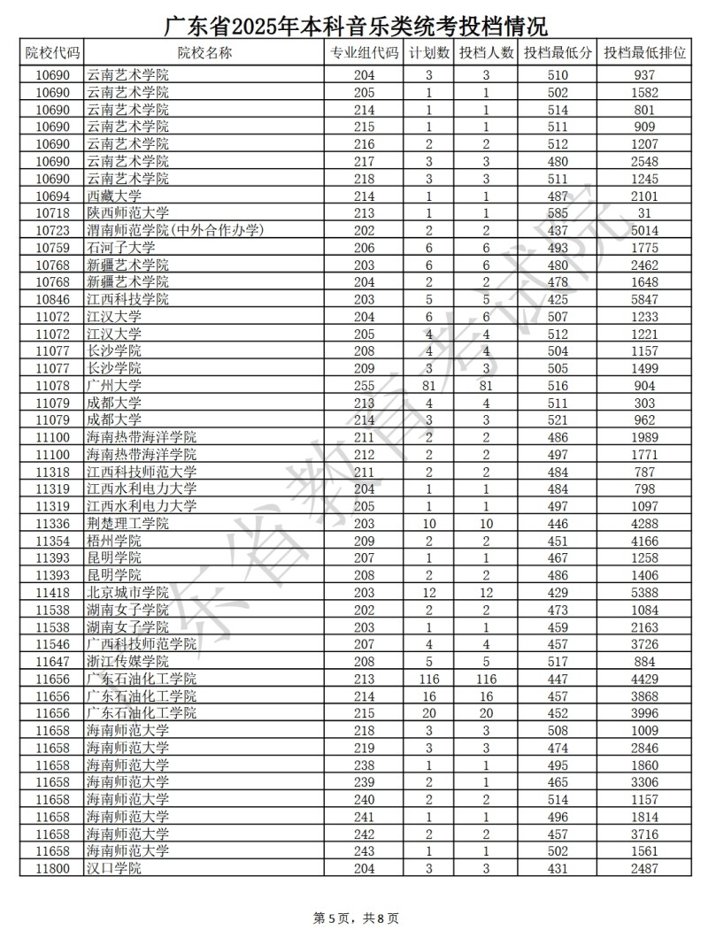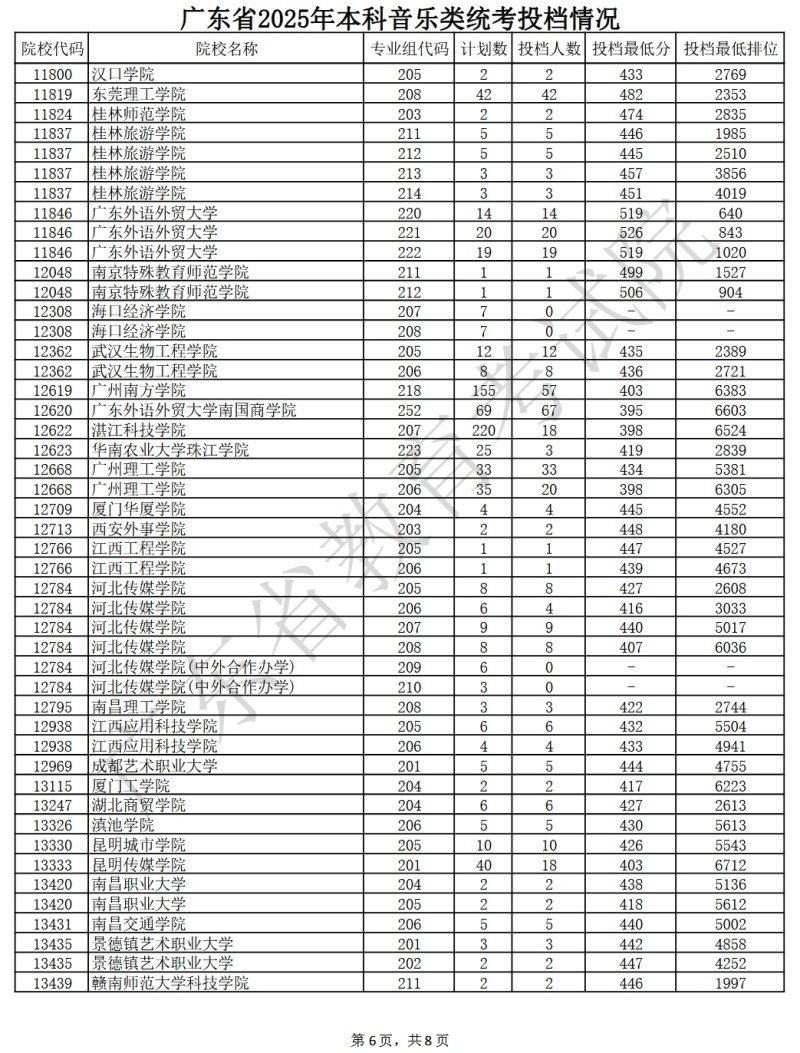 广东省2025年本科音乐类统考投档情况