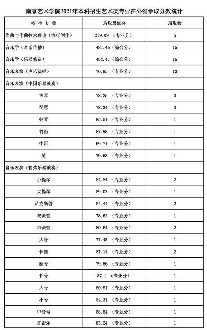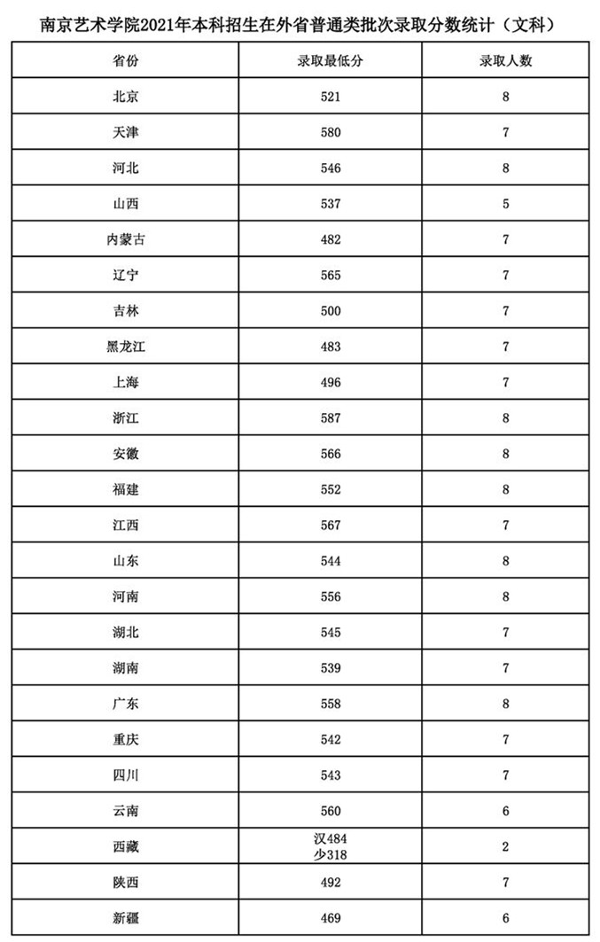 南京艺术学院2021年本科招生各专业录取最低分及录取人数