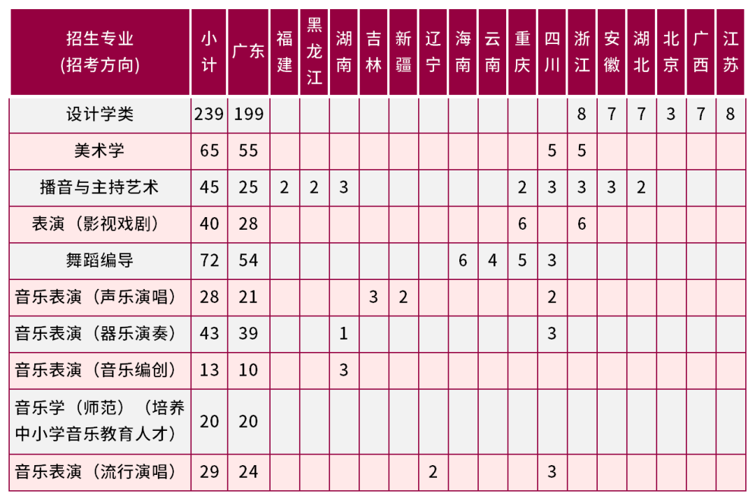1. 表演(影视戏剧)专业在广东省按校考方式招生,其他各专业均在各招生省市按统考方式招生。