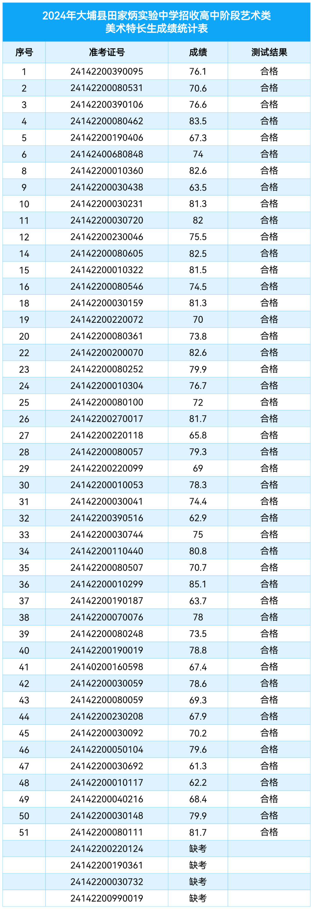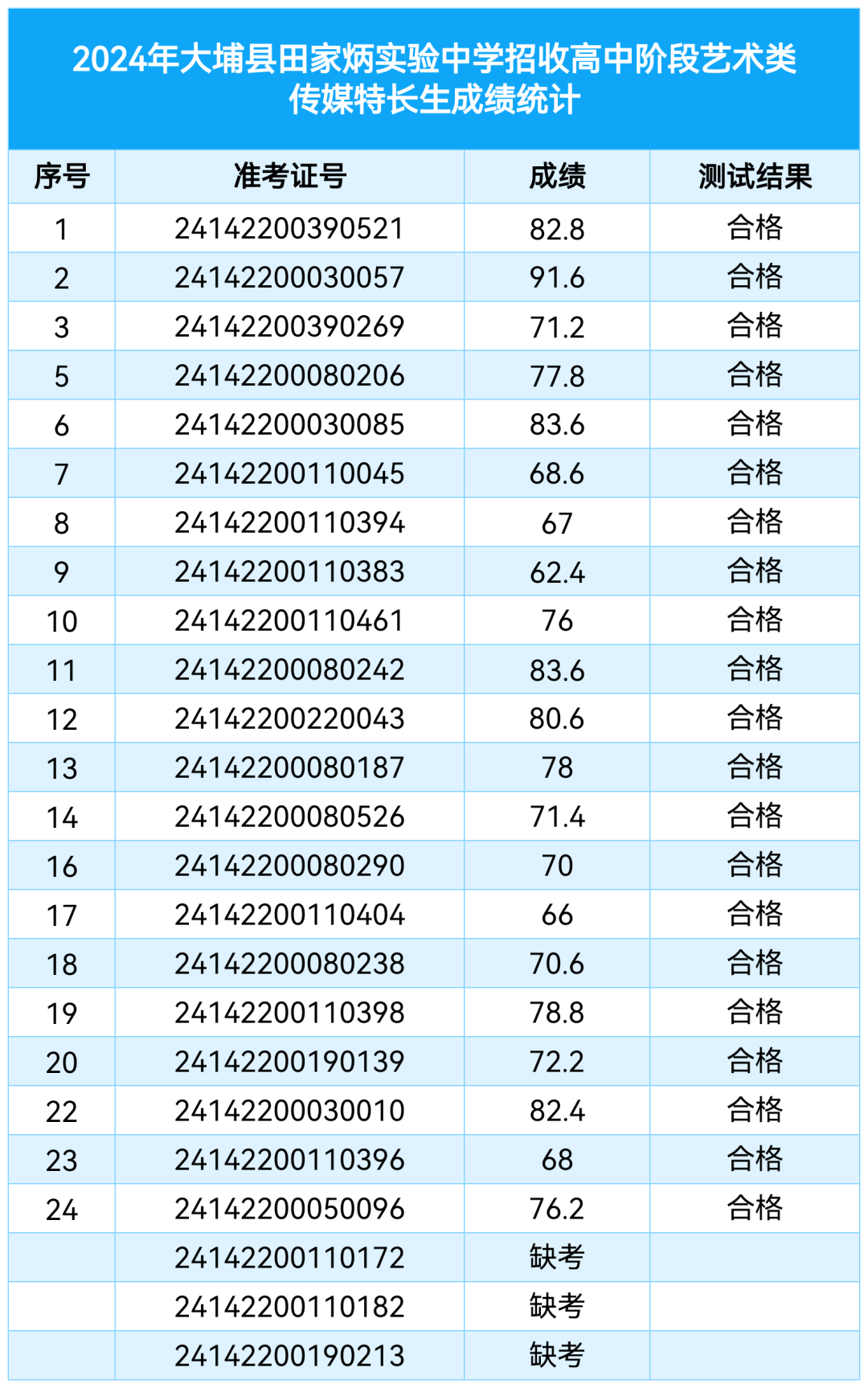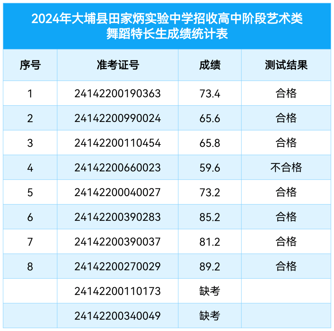 根据大埔县2024年中考招生办法,大埔县田家炳实验中学制定科学的特长生招生方案,按照择优、公开、公平、公正原则进行了专业测试,现将2024年大埔县田家炳实验中学中考特长生招生考试测试成绩公布如下: