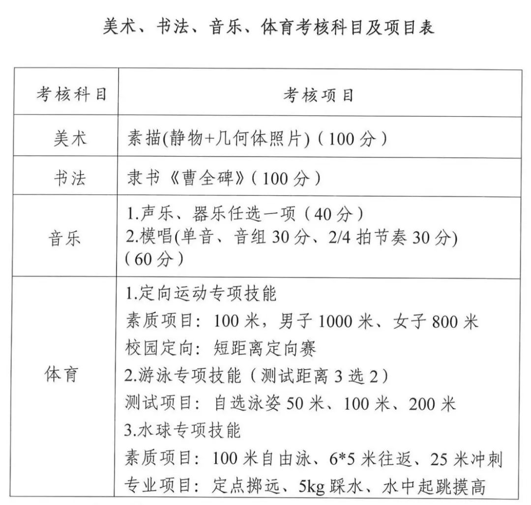 美术专业计划招生50人,书法专业计划招生5人,音乐专业计划招生20人,体育专业计划招生50人(定向运动10人、游泳20人、水球20人)。
