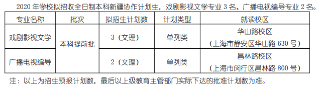 2020 年学校拟招收全日制本科新疆协作计划生,戏剧影视文学专业 3 名、广播电视编导专业 2 名。
