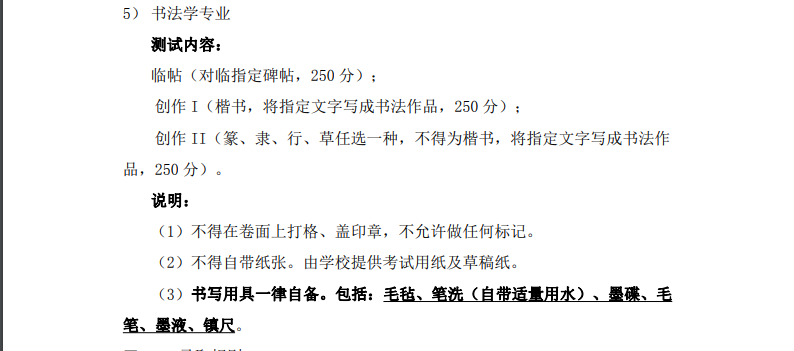 书法学专业 测试内容: 临帖(对临指定碑帖,250 分); 创作 I(楷书,将指定文字写成书法作品,250 分); 创作 II(篆、隶、行、草任选一种,不得为楷书,将指定文字写成书法作 品,250 分)。
