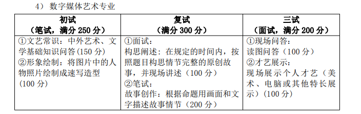 ①文艺常识:中外艺术、文 学基础知识问答(150 分) ②形象绘制:将图片中的人 物照片绘制成速写造型 (100 分)