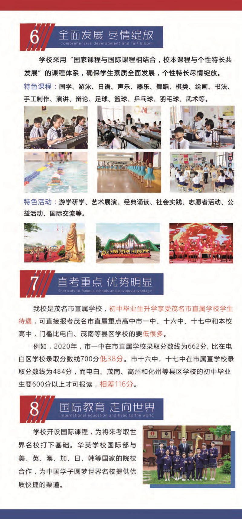 茂名市华英学校是茂名市教育局直属的一所集小学、初中、高中十二年一贯制的基础教育民办学校。学校位于茂名市区中心地段(东汇城附近),位置优越,交通便利,环境优雅。校园占地面积近6万平方米,规划建筑面积7万多平方米,办学规模120个教学班,可提供5000个优质学位。