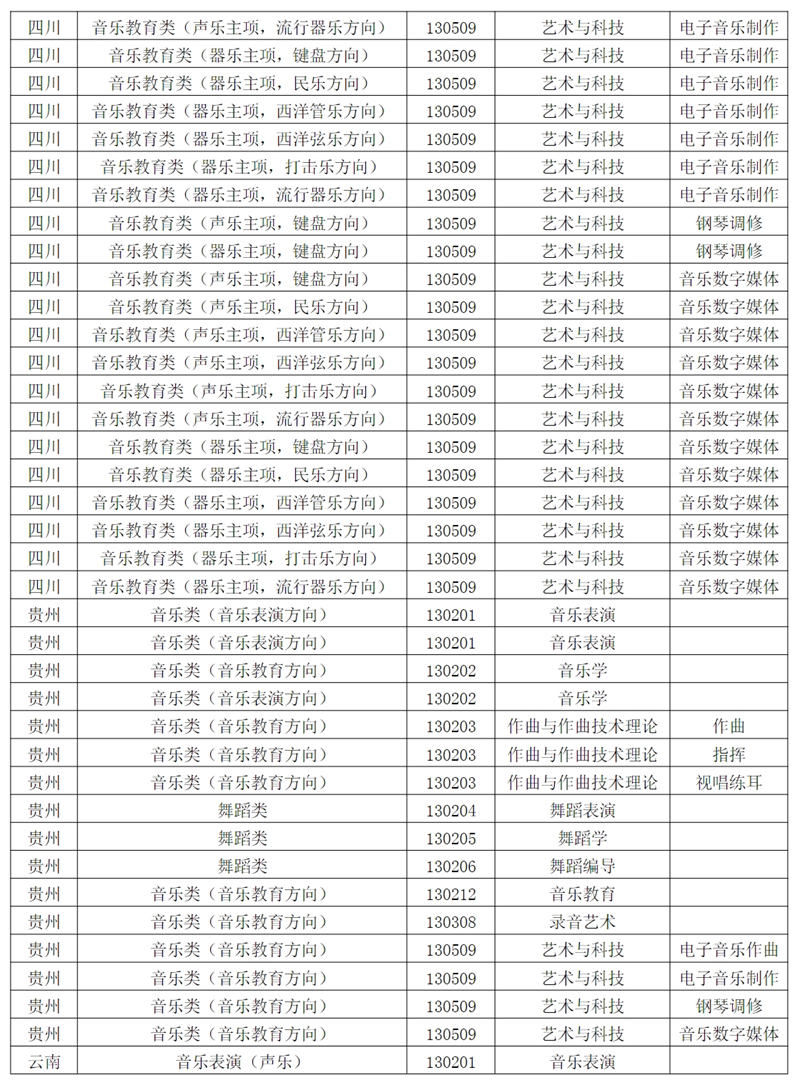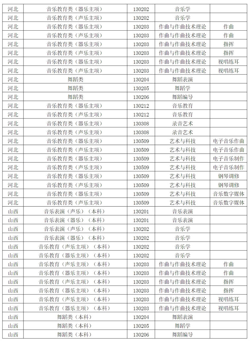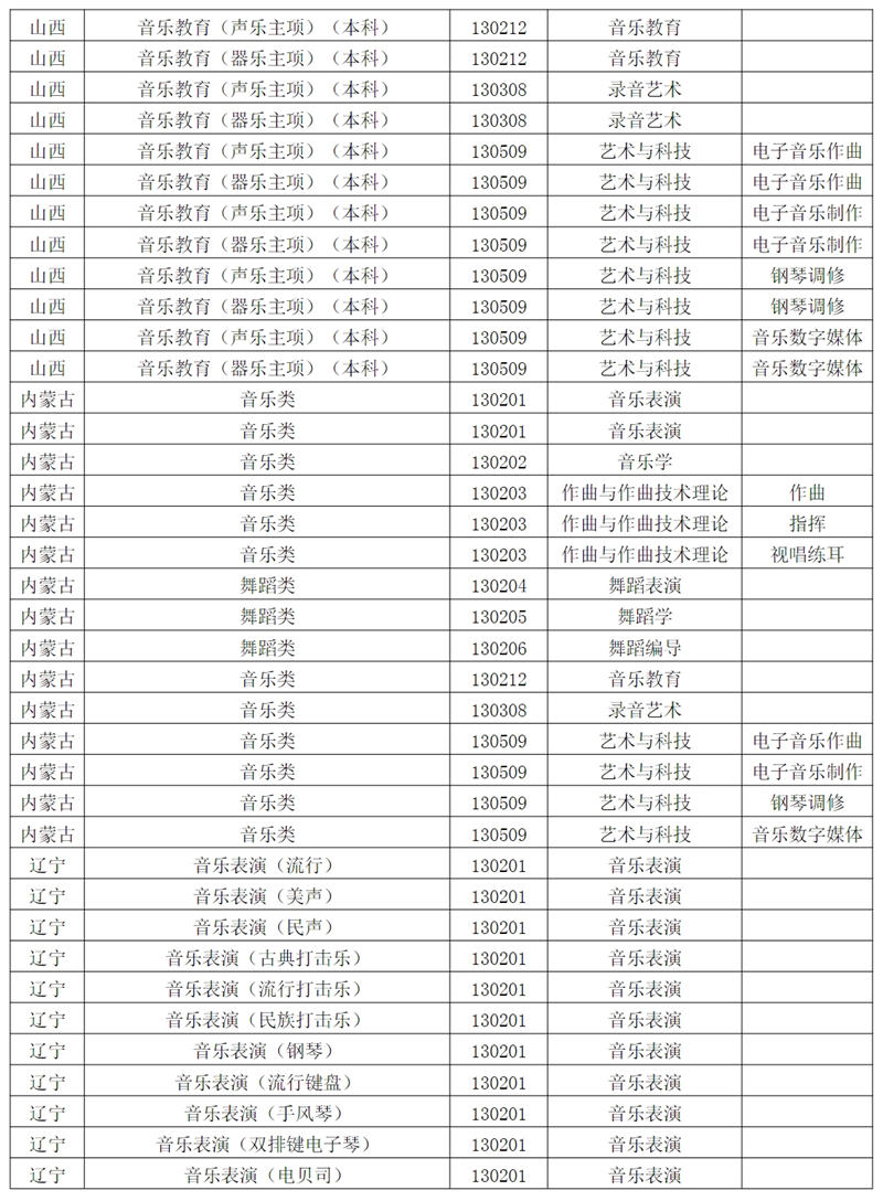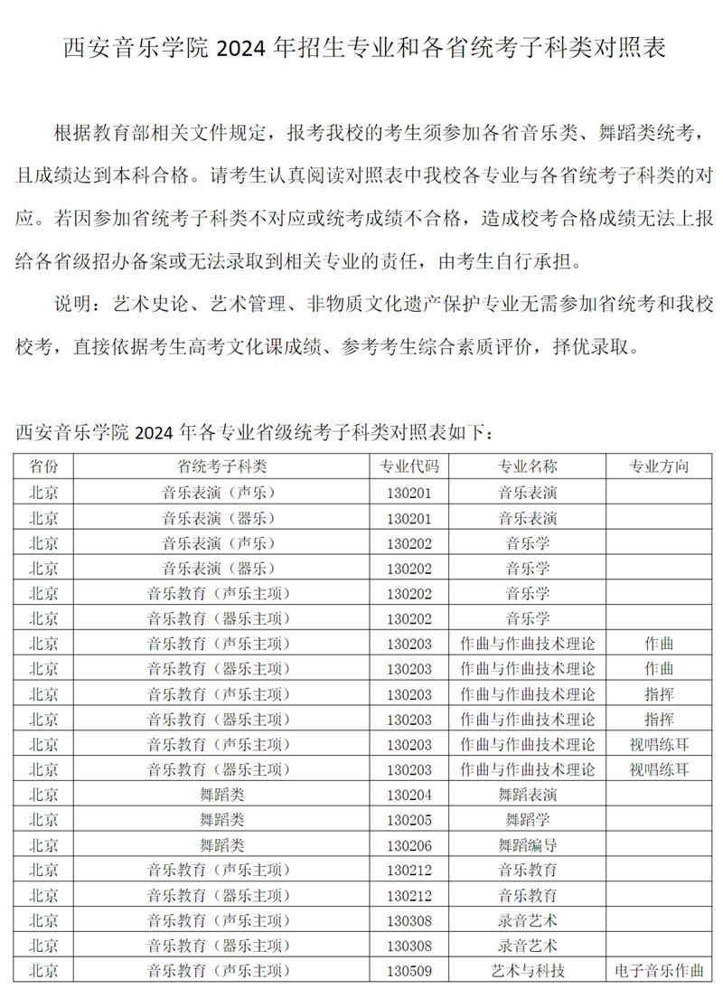 西安音乐学院2024年招生专业和各省统考子科类对照表根据教育部相关文件规定,报考西安音乐学院的考生须参加各省音乐类、舞蹈类统考,且成绩达到本科合格。请考生认真阅读对照表中西安音乐学院各专业与各省统考子科类的对应。若因参加省统考子科类不对应或统考成绩不合格,造成校考合格成绩无法上报给各省级招办备案或无法录取到相关专业的责任,由考生自行承担。