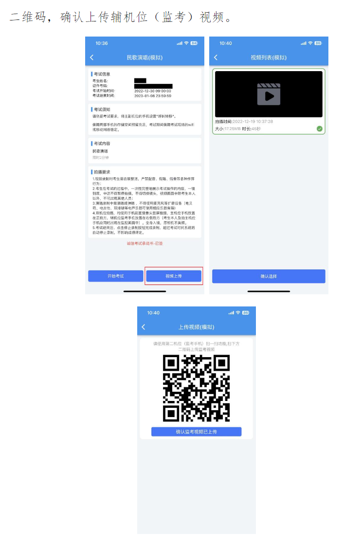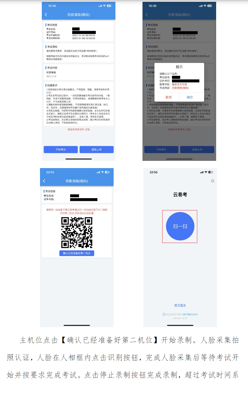 1.开始录制时,考生先在手机镜头前进行人脸识别身份认证,然后选择合适的表演位置正式开始考试,在此过程中考生不得离开录像中的画面。除考生外任何人不得出现在主机位画面,否则视为向考官传递信息,按违纪处置。