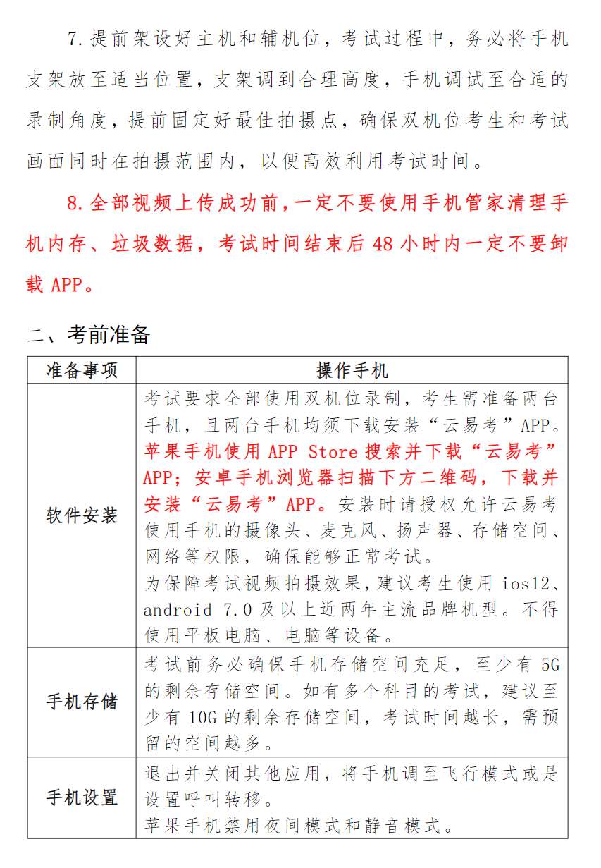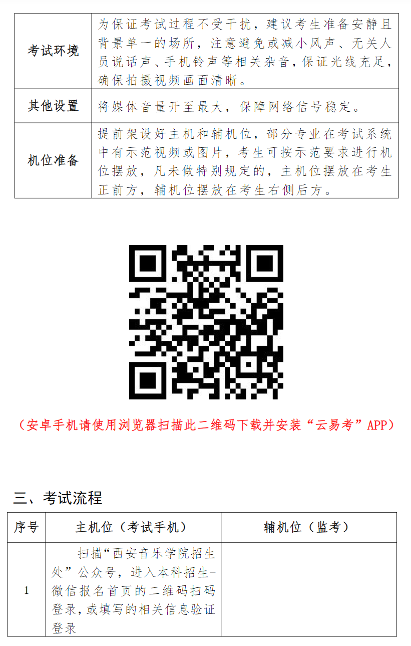2024年我校本科招生考试初试远程网络视频考试采用“云易考”APP网络考试管理系统,《远程网络视频考试“云易考”APP操作手册》(详见附件1)。所有专业均采用双机位模式,考生须使用两部智能手机,一部手机用于视频录制、材料上传(主机位),一部手机用于考试实时监考(辅机位)。部分专业在“云易考”APP上,有示范视频或图片,考生可按示范要求进行机位摆放,凡未做特别规定的,主机位摆放在考生正前方,辅机位摆放在考生右侧后方45度处,录制时须确保考生及主机位均在辅机位拍摄画面内。