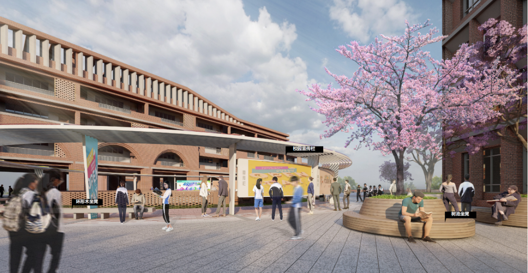 ☞ 学校划分出教学区、实验区、图书馆、生活区等主体区域,空间场所设置丰富,“书香校园”呼之欲出。