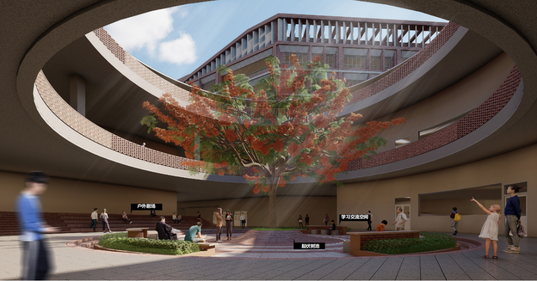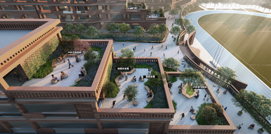 ☞ 学校建有运动区、礼仪文化广场、屋顶露台花园、圆环广场等主题分区。