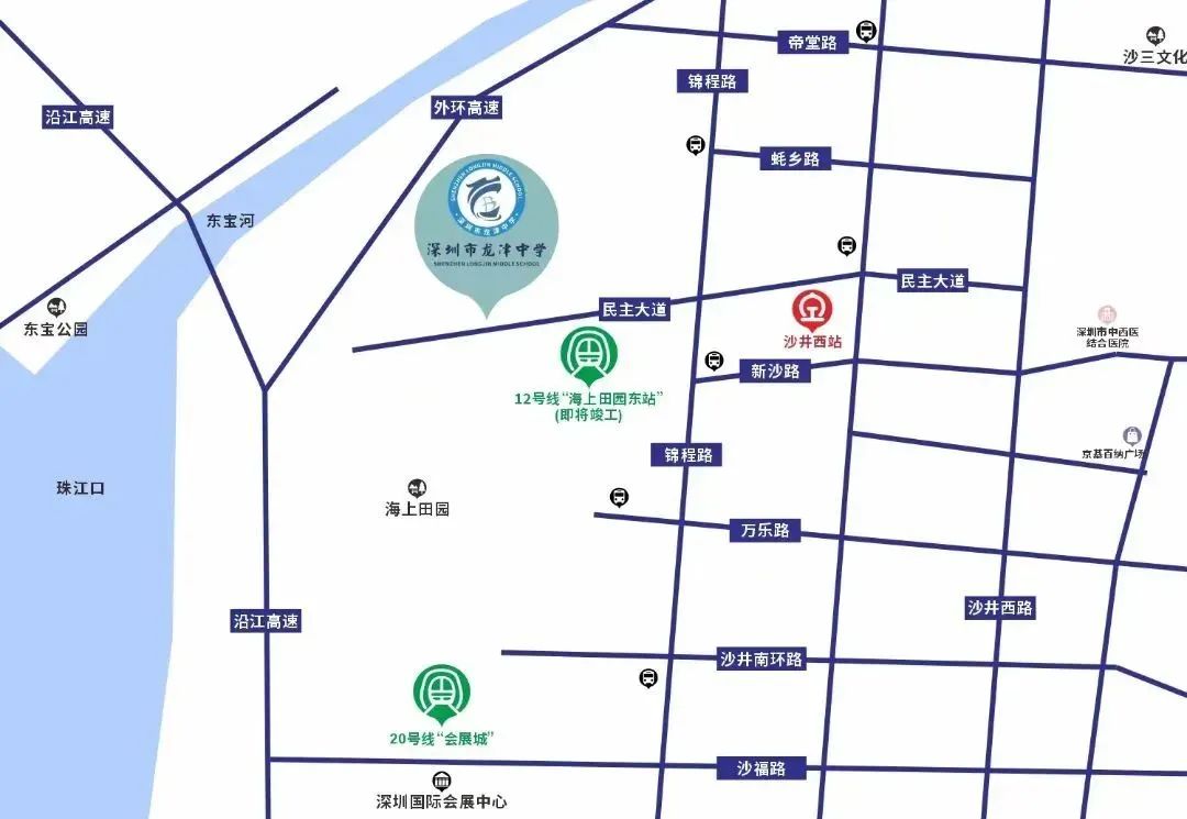 龙津中学地处粤港澳大湾区,坐落于优美静谧的珠江口,紧挨海洋新城,毗邻海上田园风景区,枕靠东宝河,对望交椅湾,观海临风,交通便利——