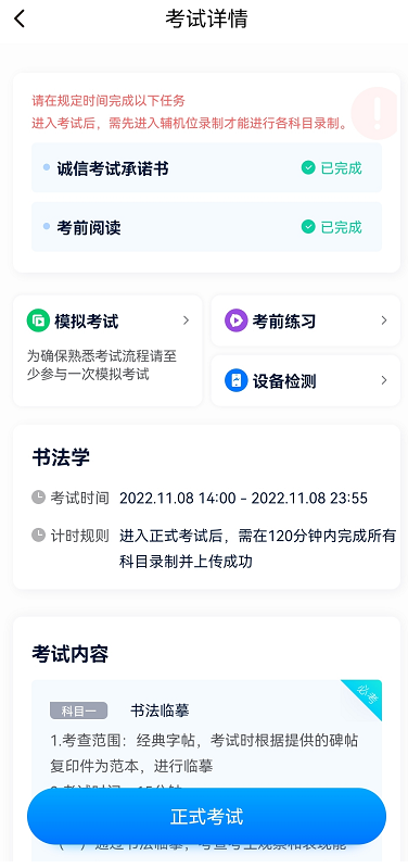 考生须在规定考试时间点击【正式考试】,请仔细阅读“考试内容”、“拍摄要求”、“拍摄时间”、“注意事项”等内容,然后进行以下操作。