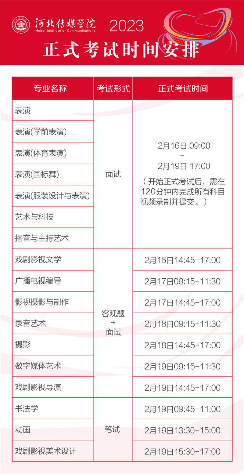 (十一)考生务必按各专业考试规定时间准时参加正式考试。有进场时间要求的专业,迟到15分钟即视为弃考处理,将无法进行考试;考生务必仔细阅读各专业考试时间、内容,在规定时间内完成考试,以防错过“正式考试”时间。一个专业只有一次报名和考试机会;
