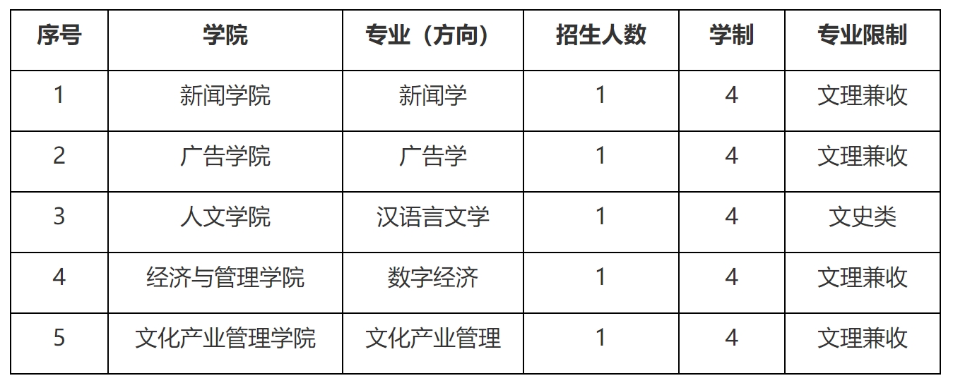 注:1.最终录取专业名称以我校2024年本科普通类招生计划公布的专业名称为准。专业介绍请登录中国传媒大学本科招生网查询,网址:http://zszx.cuc.edu.cn/static/front/cuc/basic/html_web/zyjs_list.html