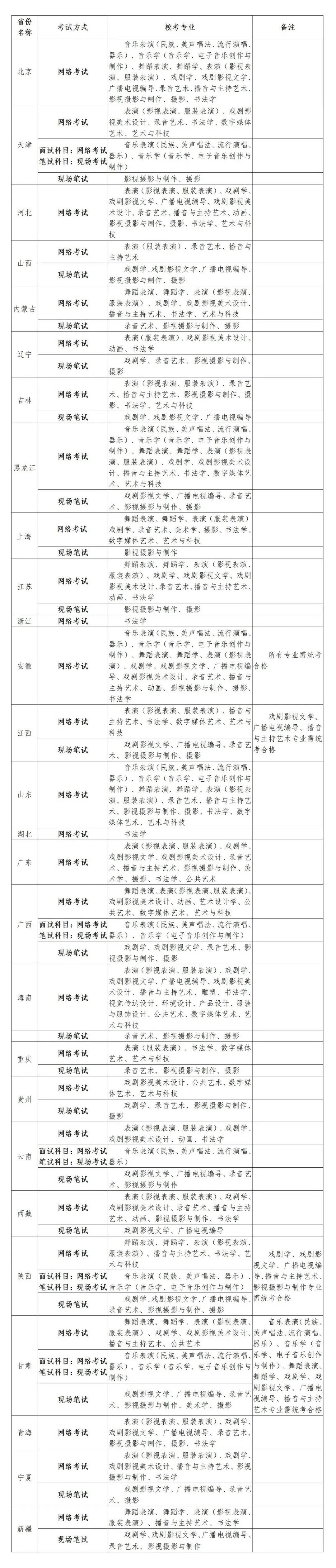 注:此表中未涉及的其他艺术类专业均直接认定各省(直辖市、自治区)艺术类统考成绩。