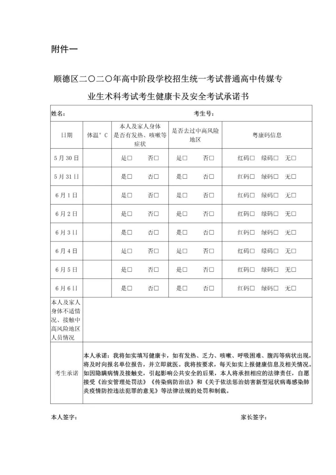 附件一:《顺德区二〇二〇年高中阶段学校招生统一考试普通高中传媒专业生术科考试考生健康卡及安全考试承诺书》