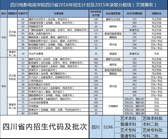 四川电影电视学院四川省2016年招生计划及2015年录取分数线(文理兼收)