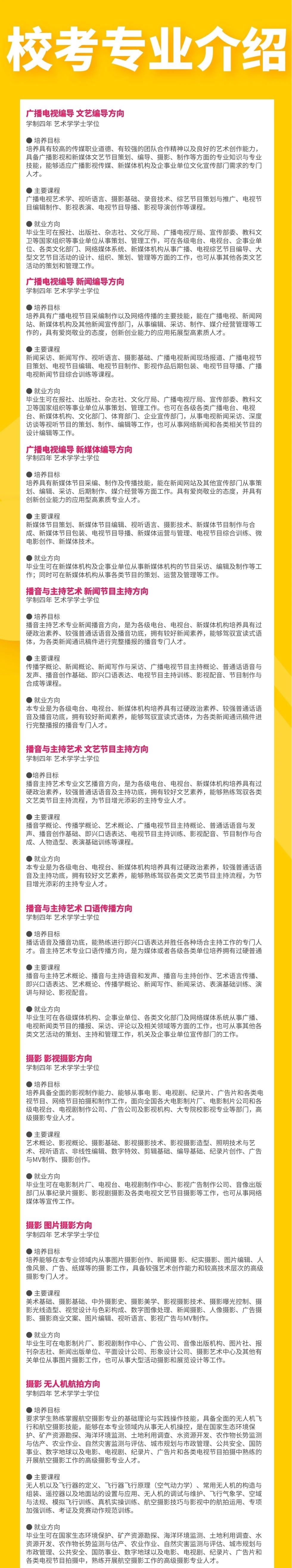学校定位于打造一所与众不同的艺术院校,以多门艺术学科交叉融合为突破口,设置会展经济与管理、学前教育、广播电视编导、播音与主持艺术、摄影、表演、艺术设计学、视觉传达设计、环境设计、书法学、录音艺术等专业,形成了艺术与现代传媒、数字创意产业紧密融合的专业群,凸显艺术学门类的学科优势。