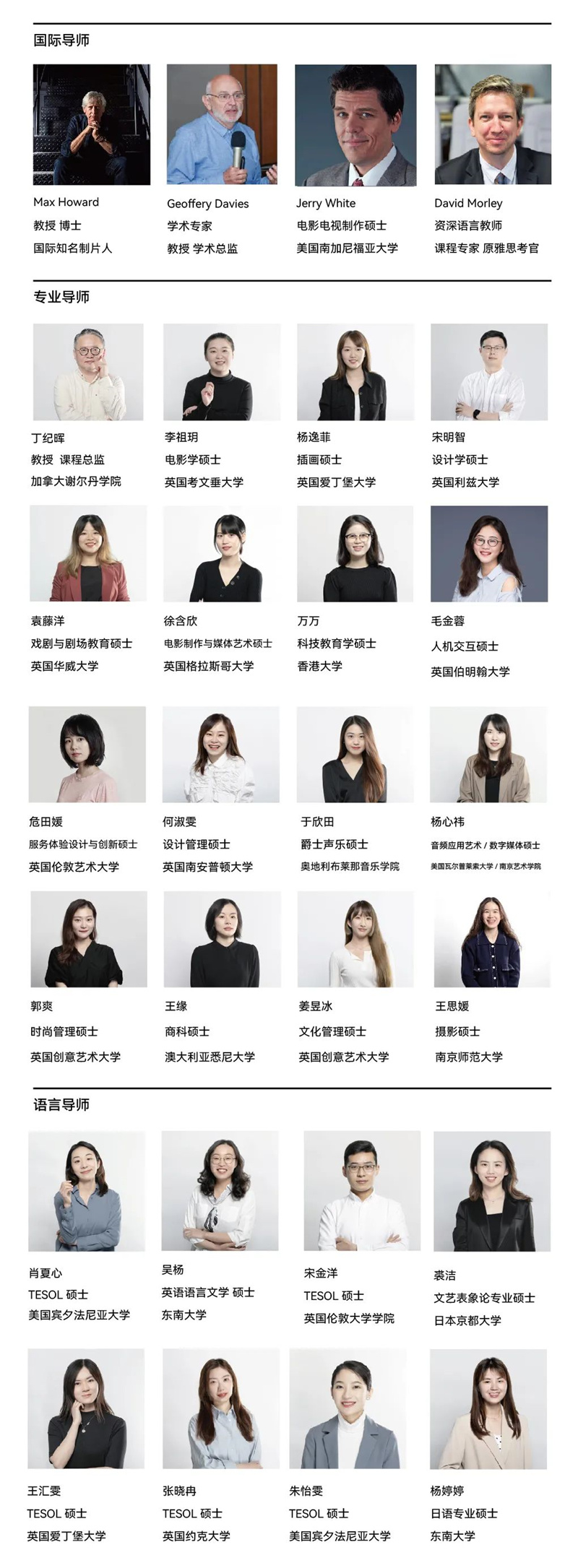 影视制作:该专业包含许多学习分支,如导演、制片、编剧、摄影、后期剪辑、影视特效制作等,学生将独立、合作拍摄他们属于自己的电影,并将参与数十部微电影拍摄和剧本的创作,尝试多种创作角色。影视专业实践是国际影视教学的重要组成部分,也是零距离接触行业的重要机会。