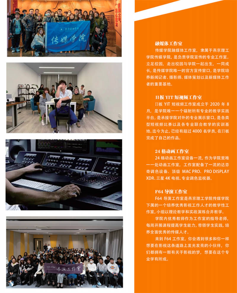主要实践环节:微视频创作实训、影视声音制作实训、电视节目制作实训、电视节目导播实训、新媒体创意实训等。