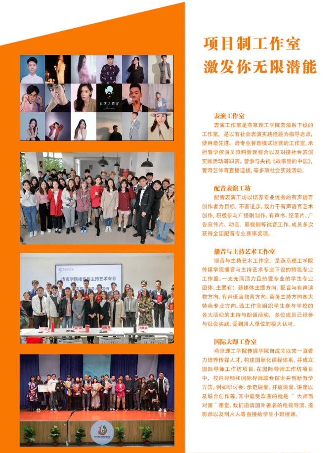 播音与主持艺术专业是燕京理工学院传媒学院开设最早的专业之一,也是品牌特色专业。播音与主持艺术专业以“展融媒体多样化主播特色,顺新时代多元化传播方向”为导向,突出以“采、编、播、剪、运”五大技能为主的应用型口语传播人才。现有在校生1000余人,专兼职教师40余人,95%专兼职教师均为中国传媒大学播音与主持艺术学院或国内双一流高校硕士;50%具有电台、电视台等一线从业经历的“双师型”教师。本专业从建设初始,始终坚持产学研一体化,校企联合育人,致力培养德智双馨、专业过硬的产业全能人才。