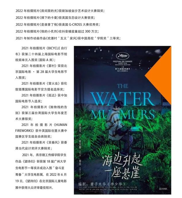 本专业汇集了一批来自业内一线和学术前沿优秀老师,紧密结合创作理论与实践。师生作品多次获得金鸡百花电影节、欧洲独立电影节、意大利那不勒斯湾独立电影节、北京大学生电影节、广州大学生电影节等海内外大奖。