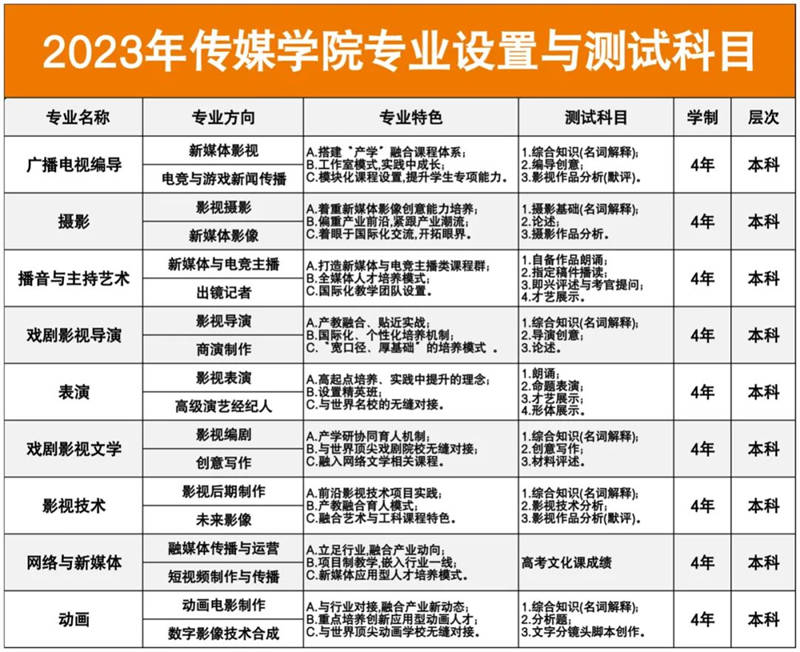 大北京、国际化、创新型传媒学院。我院位于京东地区,与北京行政副中心仅有一河之隔,是集传媒教育、产业和技术研发于一体的大型综合性产教生态共同体。学院现开设广播电视编导、摄影、播音与主持艺术、戏剧影视导演、戏剧影视文学、表演、影视技术、网络与新媒体、动画等本科专业。来到传媒学院,你就踏进了北京主流的传媒、教育产业圈。