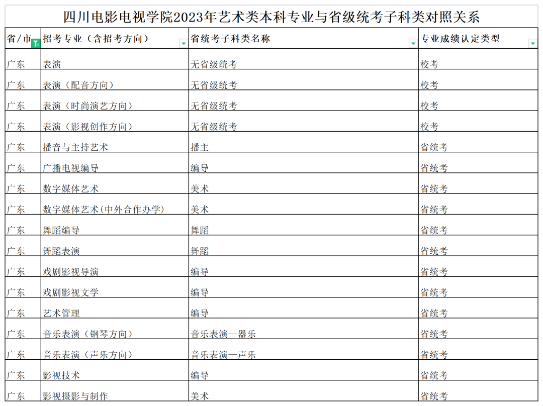 现将四川电影电视学院2023年艺术类本科专业与广东省级统考子科类对照关系予以公布。