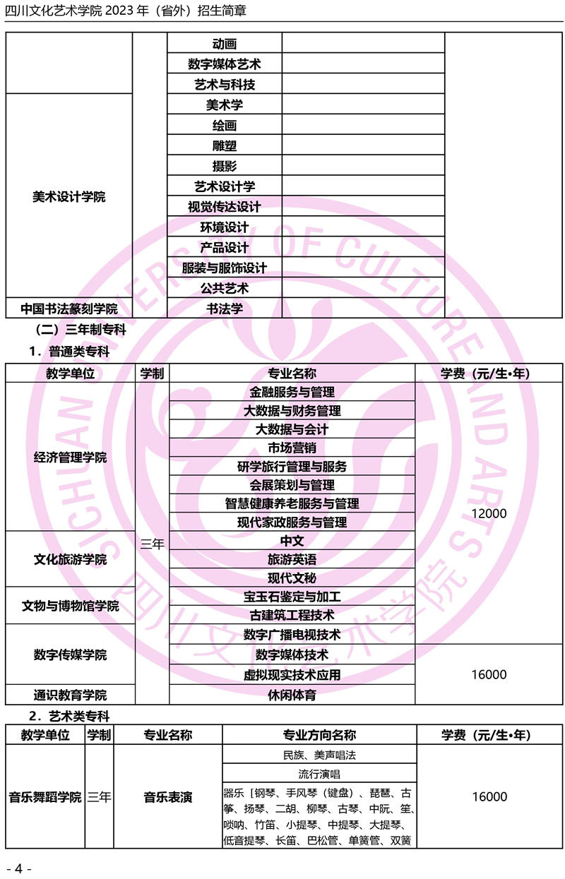 四川文化艺术学院现开设本科专业44个、专科专业32个,涵盖艺术学、文学、经济学、管理学、教育学、工学、历史学、法学等8个学科,拥有省级一流本科专业建设点3个。四川文化艺术学院设有马克思主义学院、通识教育学院、音乐舞蹈学院、戏剧影视学院、数字传媒学院、美术设计学院、中国书法篆刻学院、经济管理学院、文化旅游学院、文物与博物馆学院、心理与教育学院、继续教育学院、大数据学院共13个二级学院,以及国际学院。建有中国非物质文化遗产研究院、王蒙文学艺术馆、文昌文化研究院、巴蜀石窟乐舞艺术研究院、羌文化保护与发展研究中心、科技艺术研究院、文化艺能与社会心理研究中心等科研机构。