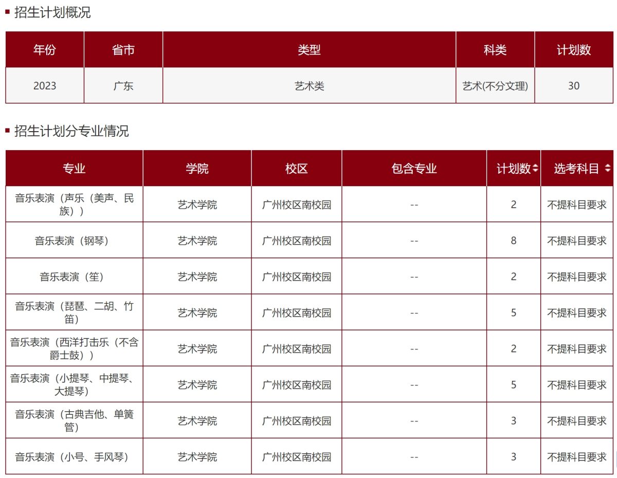 中山大学音乐类专业2023年面向广东省招生计划分专业情况