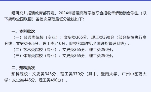 经研究并报请教育部同意,2024年普通高等学校联合招收华侨港澳台学生(以下简称全国联招)各批次录取最低分数线如下: