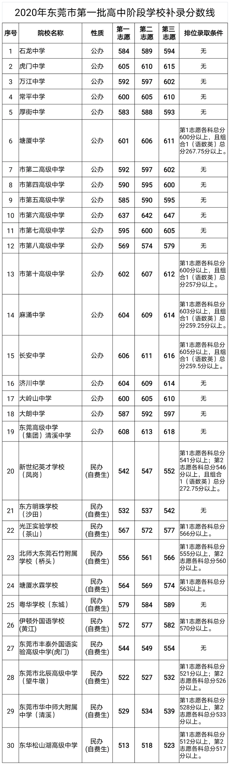2020年东莞市第一批高中阶段学校补录分数线东莞市2020年高中阶段学校招生录取工作目前已完成第一批次普通高中录取。在第一批次补录阶段,经公告补录空余学位,考生填报补录志愿,电脑配档等环节,现第一批次普通高中补录最低录取分数线和排位录取条件已划定